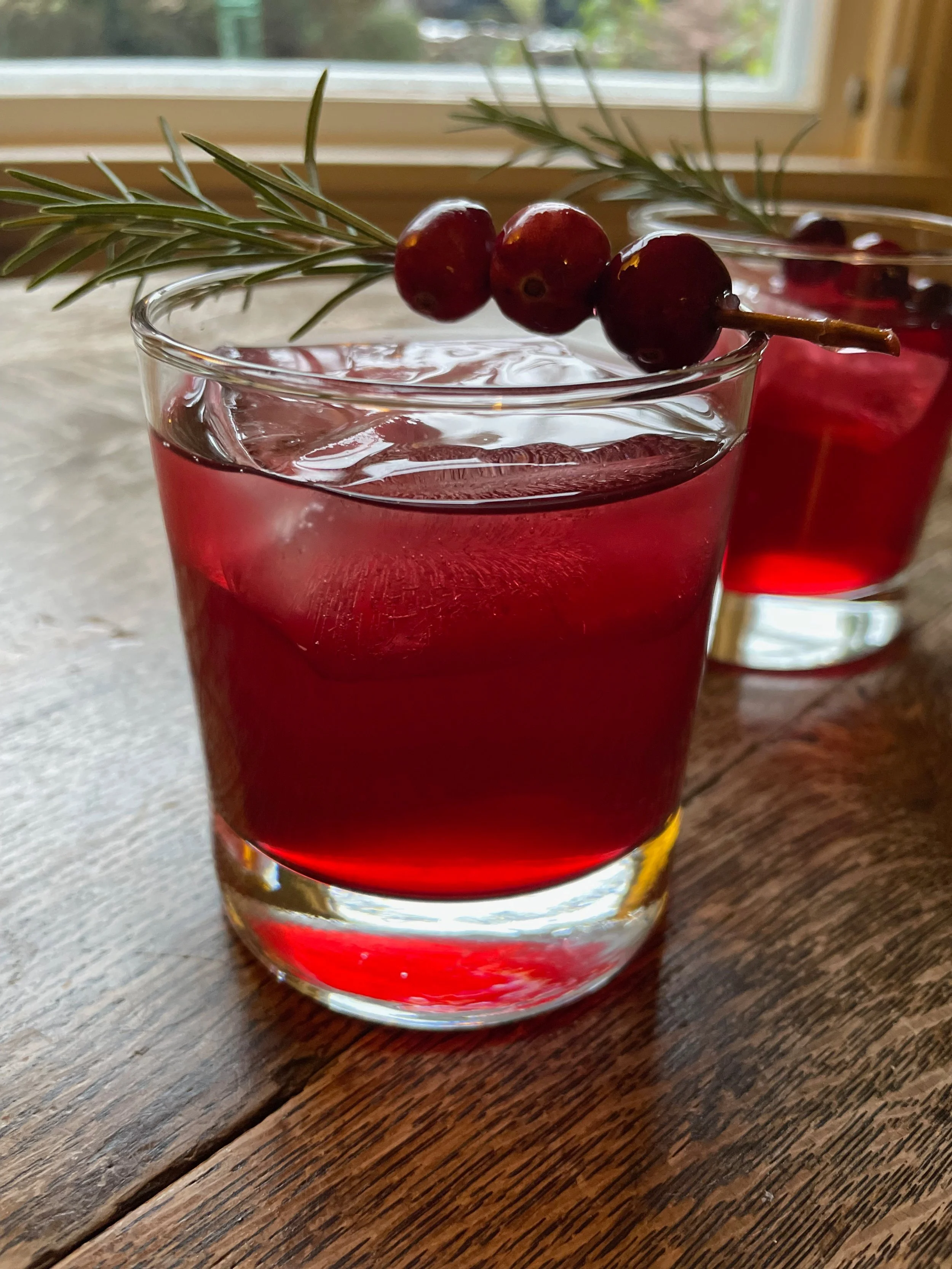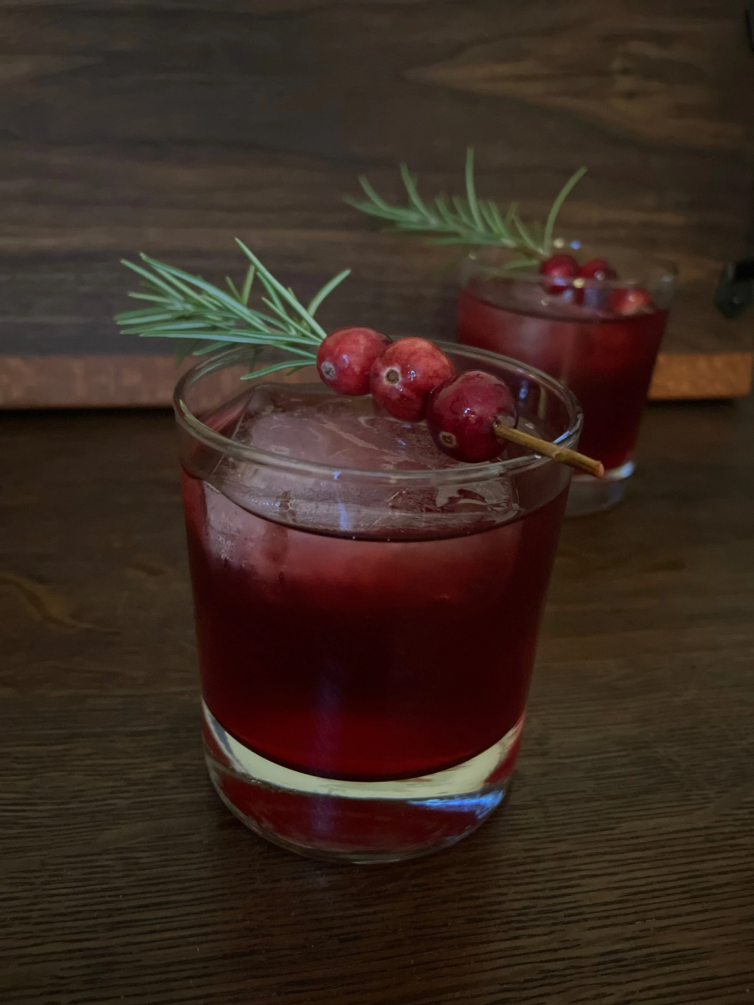 Garnish with a rosemary sprig with a few cranberries strung on the base of it, or a dehydrated blood orange wheel