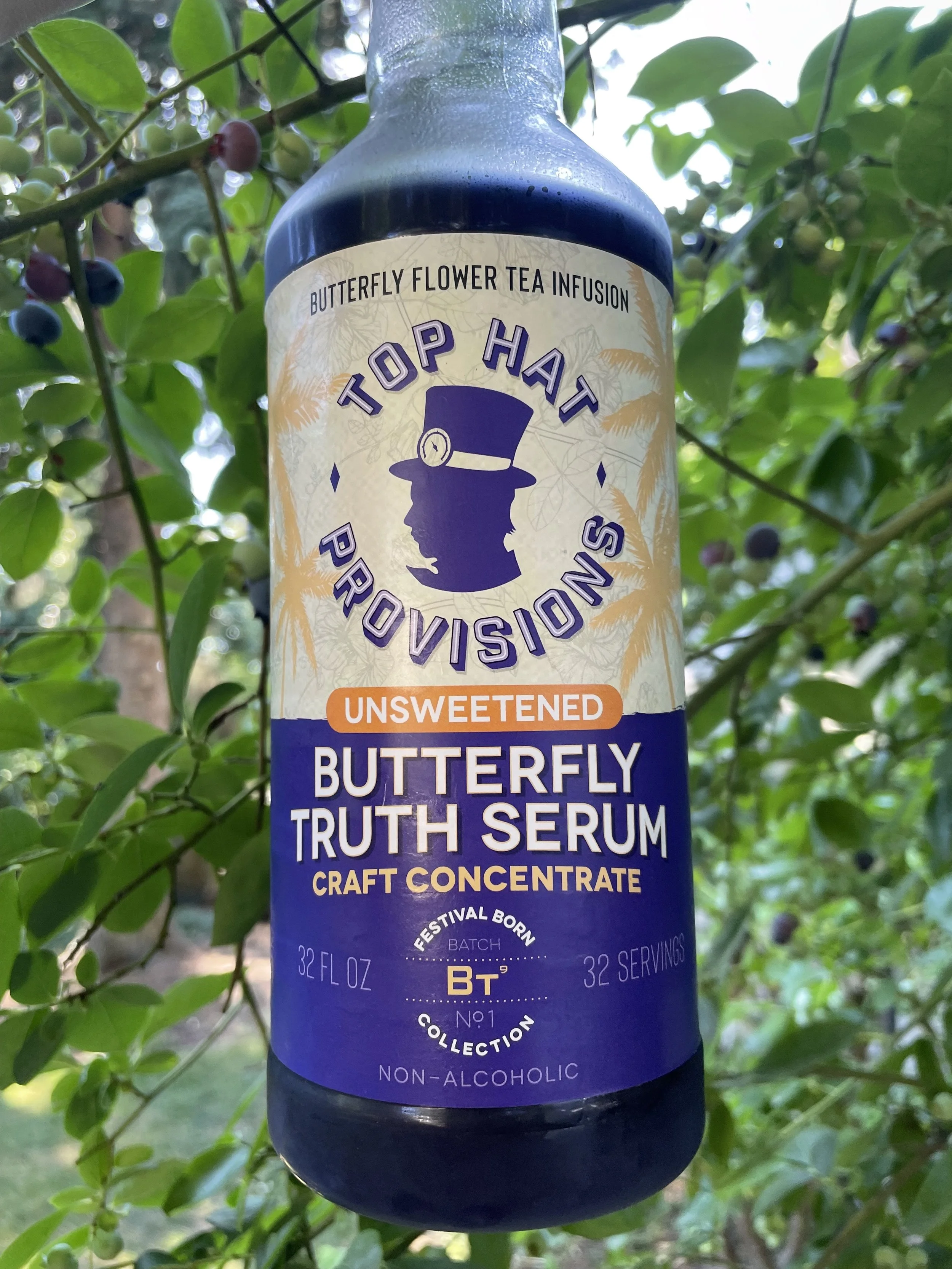Let lavender sit in syrup while it cools to room temp. Strain flowers from syrup and store in fridge.Buy Butterfly Truth Serum from Top Hat Provisions.